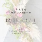 2025.12.03 NEWS 年末年始の休業のお知らせ alllifeflower こんにちはAll Life Flowerの塩月です。 年末年始の休業のお知らせになります。1月5日からは通常通りの営業になります。急な変更等がございましたらInstagramでお知らせしますのでご確認を宜しくお願いします。 ABOUT ME InstagramLINEContact