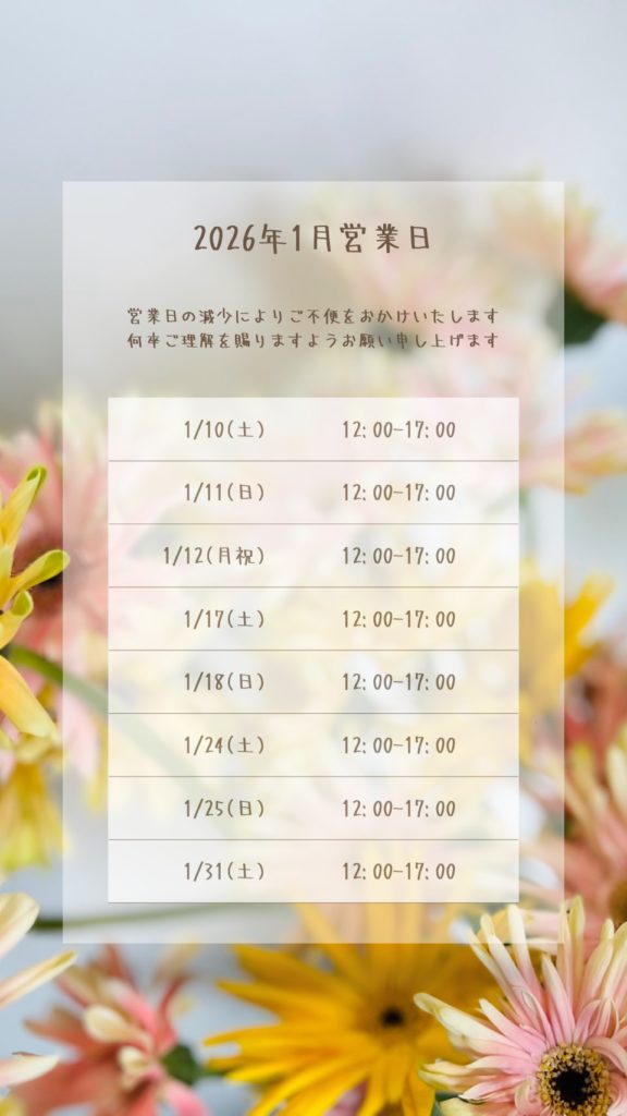 2026.01.06 NEWS 1月の営業日のお知らせ alllifeflower こんにちはAll Life Flowerの塩月です。 1月の営業日のお知らせになります。本年より営業日を縮小しての営業になります。急な変更等がございましたらInstagramでお知らせしますのでご確認を宜しくお願いします。 ABOUT ME InstagramLINEContact